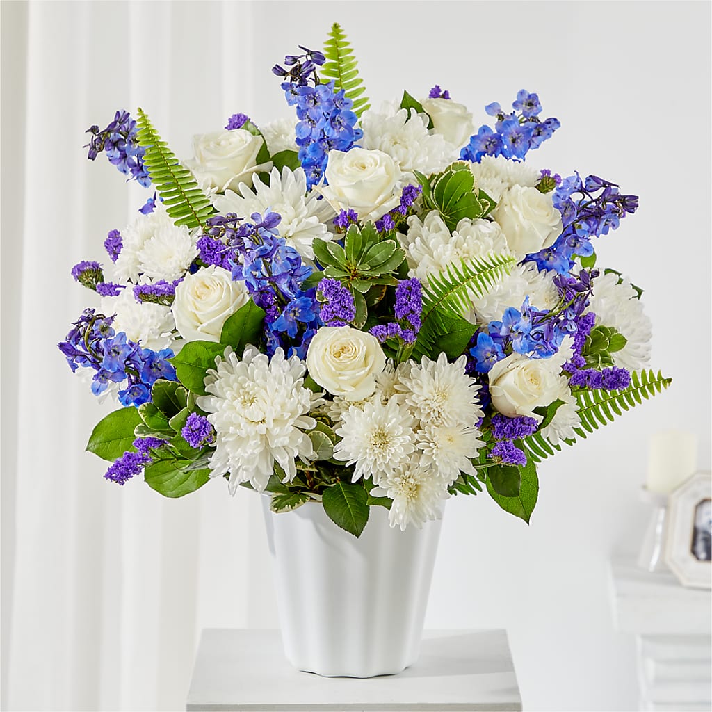 A basket fit for a table or floor, filled with tranquil white and blue blooms, is a lovely way to share your condolences during a service.