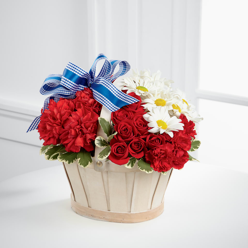 Our Justice Basket is a perfect display of patriotic beauty. Red spray roses, carnations and miniature carnations are accented with a spray of white standard daisies presented in a whitewash basket gorgeously accented with a blue designer ribbon to create a floral arrangement that will do your heartfelt sentiment justice.